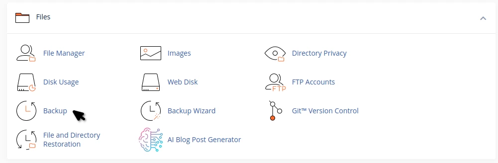 - cPanel cPanel नियंत्रण कक्ष में लॉग इन करने के बाद, FILES अनुभाग में, हम Backup प्लगइन तक पहुंचेंगे