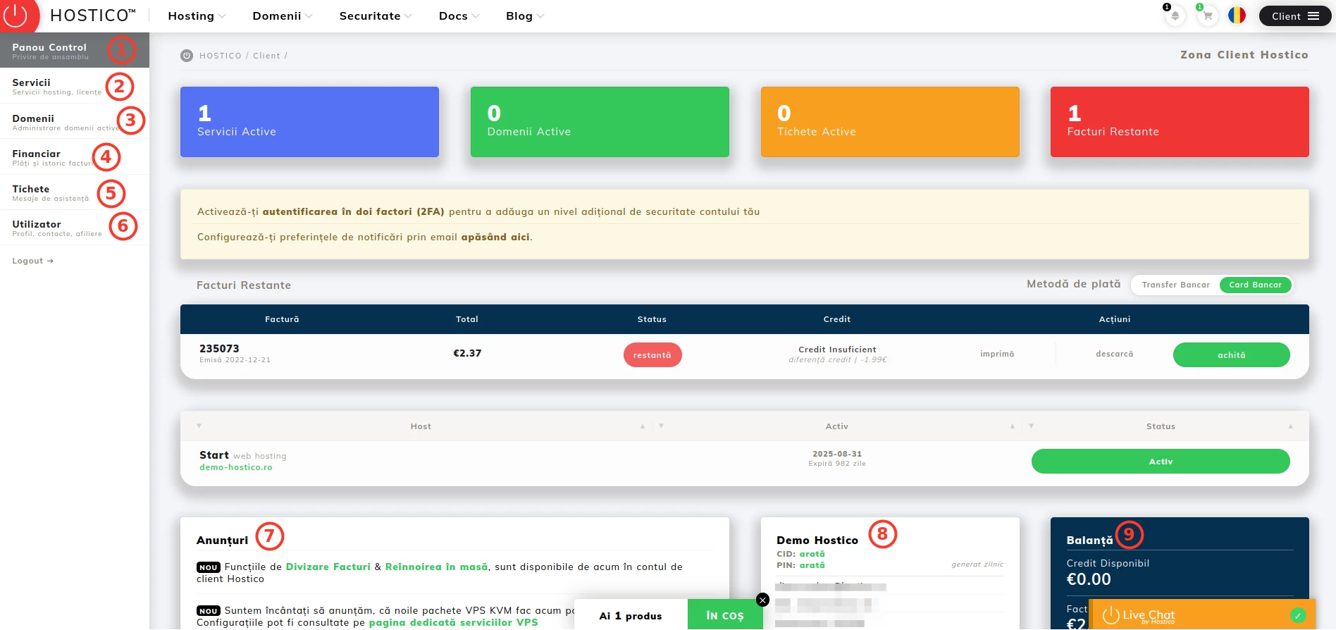 - (8) Hostico डेमो - ग्राहक खाते से अद्वितीय जानकारी प्रदर्शित करता है जैसे कि आईडी या पिन कोड;