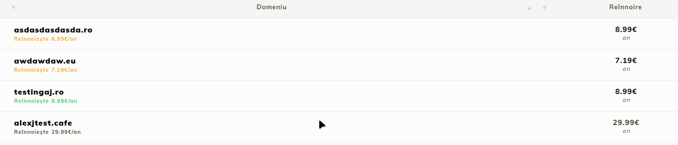 - आपके द्वारा Hostico के साथ पंजीकृत डोमेन प्रदर्शित किए गए हैं। आप नाम, स्थिति, शेष सक्रिय अवधि और नवीनीकरण लागत देख सकते हैं।