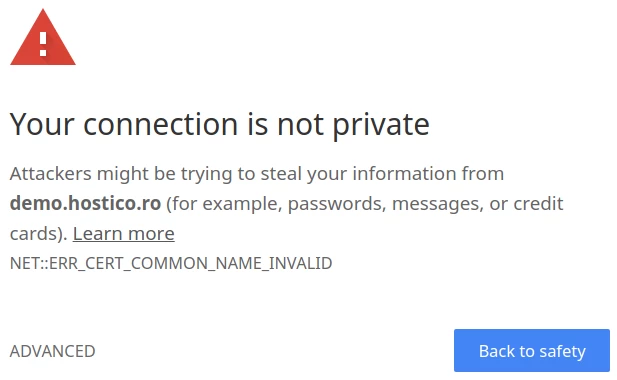 यह संदेश का मतलब यह नहीं है कि साइट डाउन या अनुपलब्ध है। इसे अभी भी Advanced बटन पर क्लिक करके, फिर Proceed to domeniu.tld (unsafe) पर क्लिक करके एक्सेस किया जा सकता है।